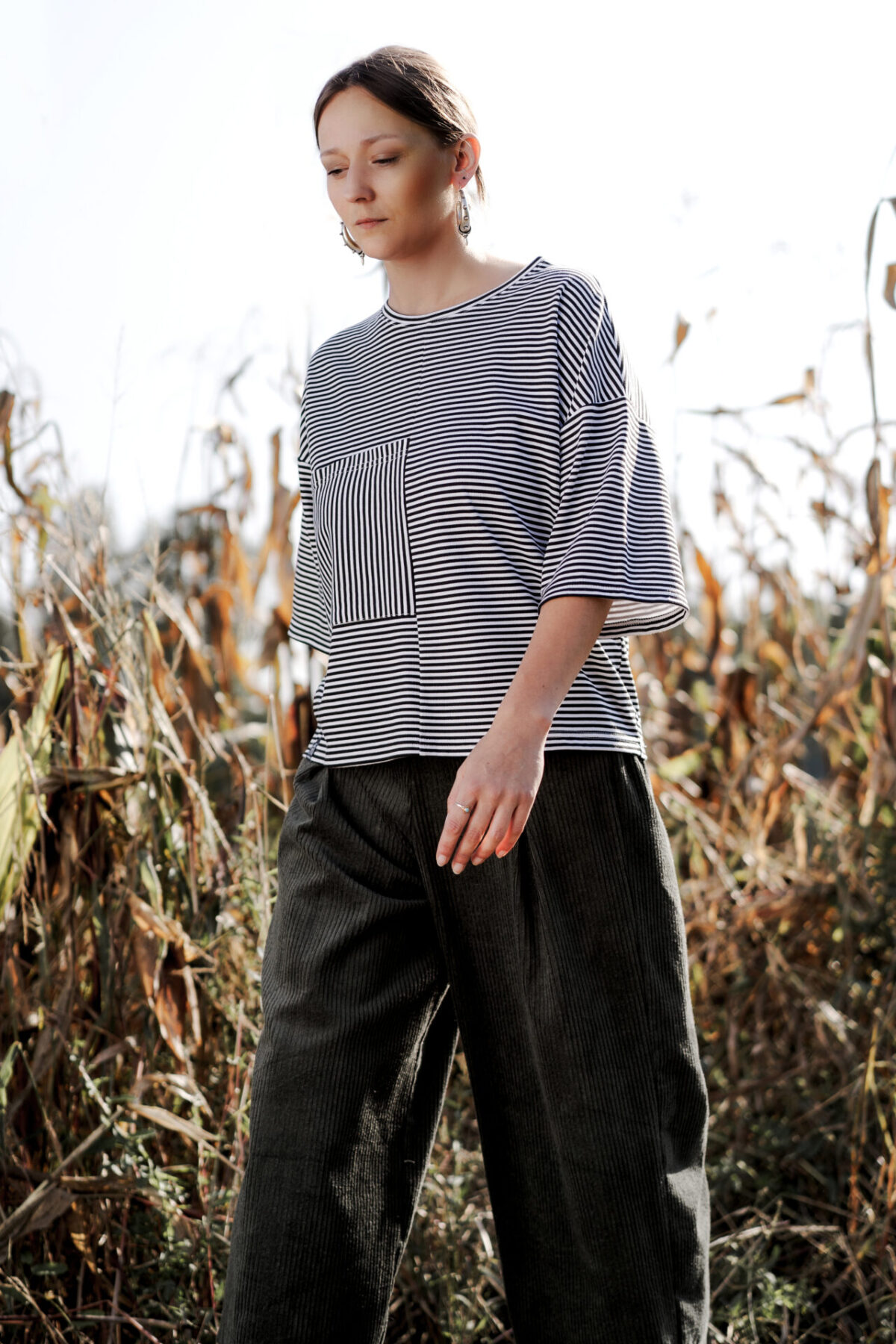 - ciekawy krój, oversizowy, luźny, z przodu bluzki naszyta duża kieszonka