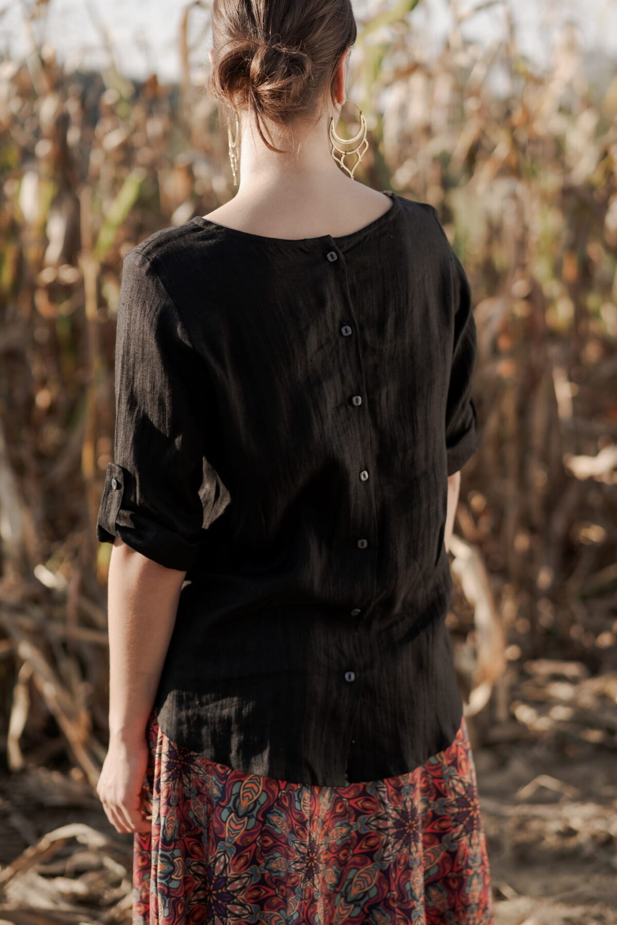 Bluzka ma luźną formę, z tyłu jest zapinana na guziki