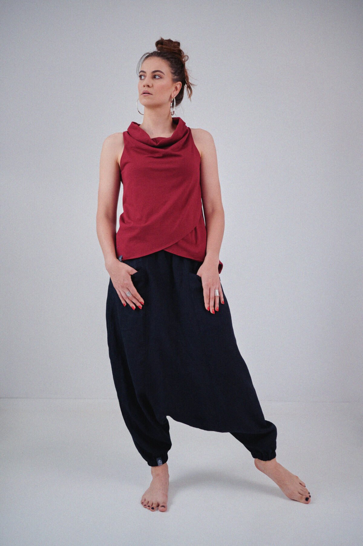 Luźne wygodne lniane spodnie z niskim krokiem